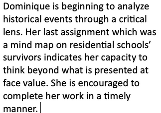 Above: Sample of my assessments for grade 6 students' progress in Social Studies. These comments can potentially be used in a progress repot. The names have been changed to protect the identity of the students.